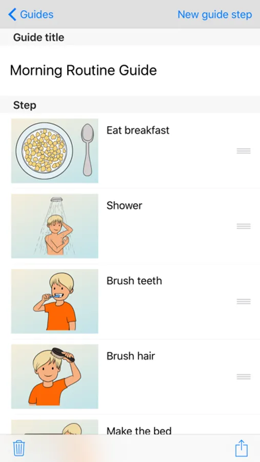 - Create guides when you have a sequence of actions in routine situations, such as dress. Add images of the clothing to be taken and record the corresponding audio instructions.