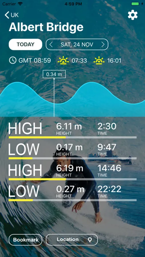An exciting feature of this app is the “Near Me” search screen, which will show your current location, as well as tide information for available nearby locations. It’s a one stop resource for ensuring you can optimise your outdoor experience for what you enjoy doing most.