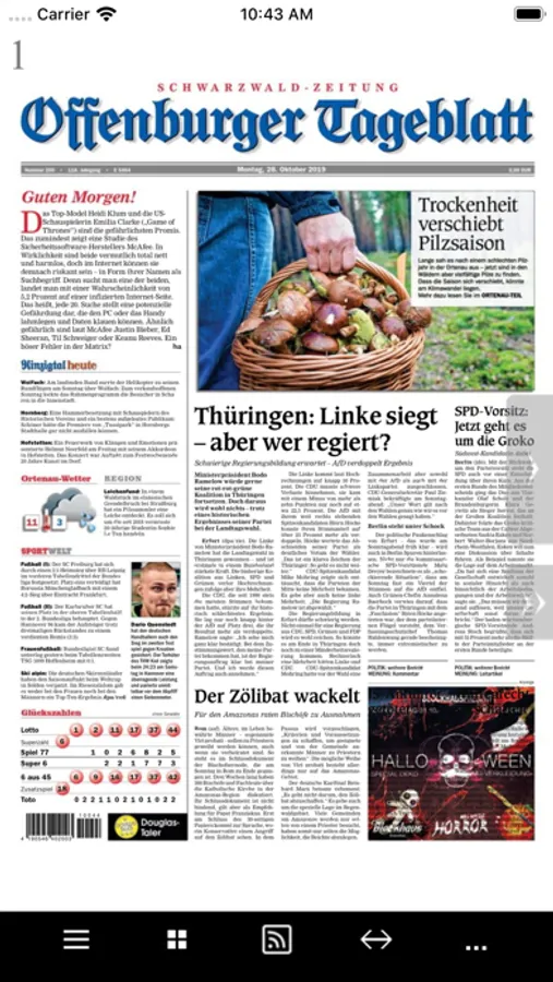 Täglich finden die Leser im Offenburger Tageblatt - Schwarzwald Zeitung spannende Informationen, gut recherchierte Hintergründe, pointierte Kommentare, Unterhaltung und Tipps zum täglichen Einkauf. Und auch das Vereinsleben und die Familiennachrichten aus den Städten und Dörfern des Schwarzwaldes kommen nicht zu kurz.