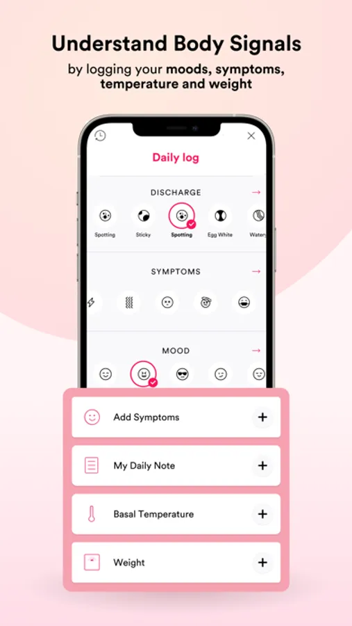 - Log flow, symptoms, moods, weight, temperature, and notes