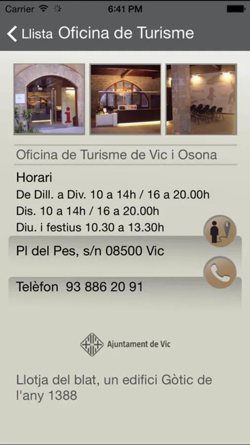 Aplicación oficial de la ciudad de Vic en Osona. Permite situar los diferentes puntos turísticos, hoteles, restaurantes y la oficina de turismo en un mapa y una lista. También permite conocer su información.