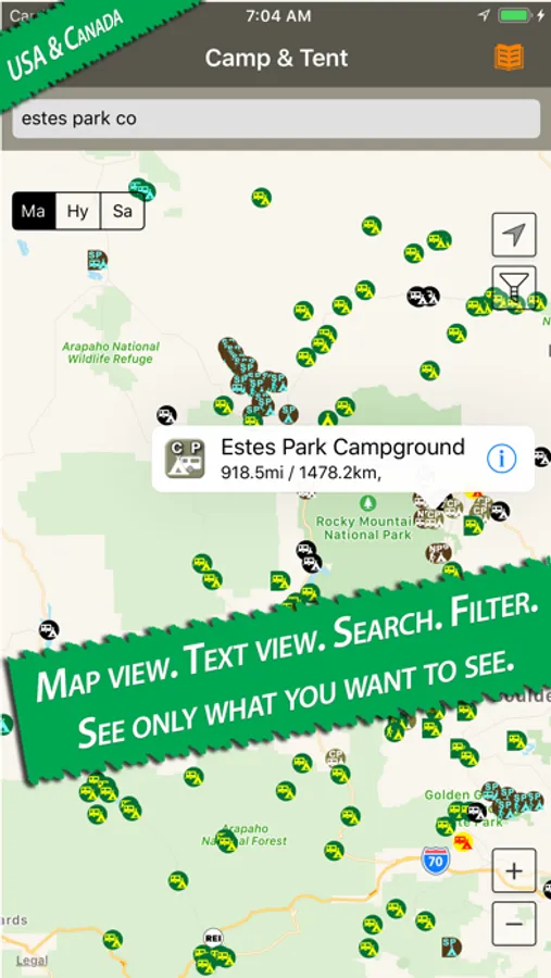 -Map view: uses GPS and maps to plot up to 150 points at a time. Starting from your current location, you can zoom out and in or jump to anywhere in the USA and Canada. This mode shows everything. Filter the map to view only what you want: KOA, Forests, BLM, or maybe REI stores.