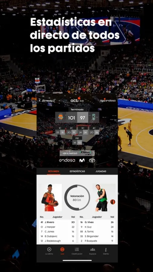 Sigue en acb Live las estadísticas en directo de todos los partidos de nuestras competiciones. Salta de cancha a cancha consultando los números de tu jugador favorito, la comparativa de equipos, el jugada a jugada o los líderes del partido. Filtra todas las estadísticas por cuartos u ordena el box score a tu elección.