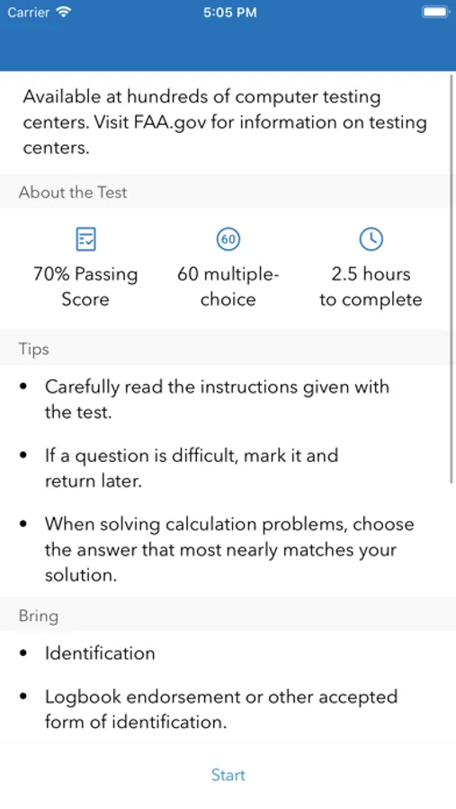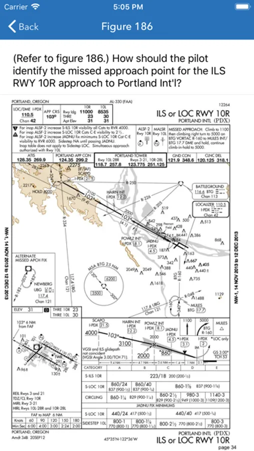 Test mode randomly generates a 60-question session from the entire database of published FAA test questions, simulating the real Instrument Pilot test. After answering all the questions, you’ll be given instant results, and have the option to review either all the questions, or just missed questions. Included in the review session are the same detailed explanations for why each answer is right or wrong.