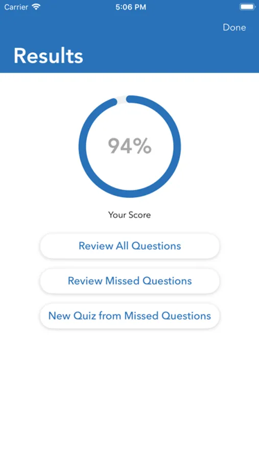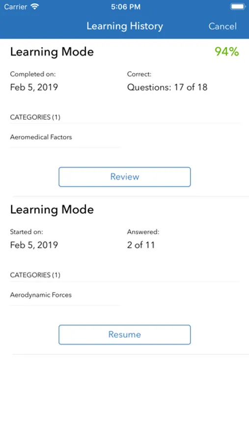 After completing each test your results are saved in the app's Progress Report section, where you can review previous scores and and a detailed history of each question and answer selection. You can also pause a partially-completed session, and resume it at a later time here.