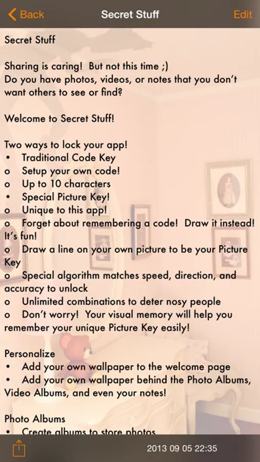 • Add your own wallpaper behind the Photo Albums, Video Albums, and even your notes!