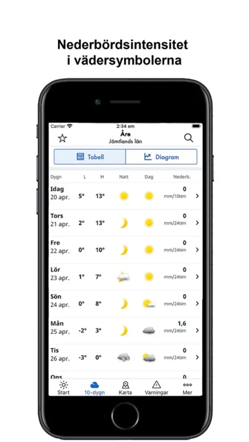 + I tabellform med vädersymboler