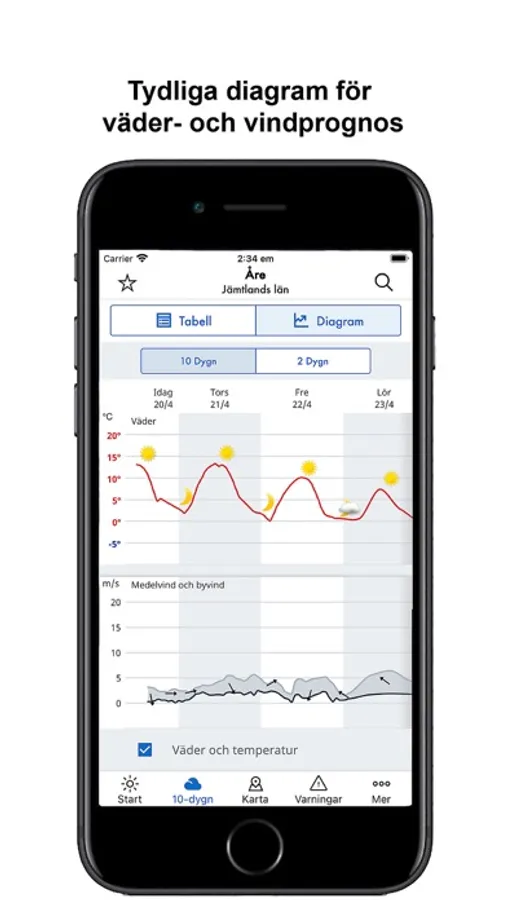 SMHIs app visar väderprognoser för ett stort antal orter, både i Sverige och utomlands, samt varningar när allvarliga väder- och vattenhändelser förutses.