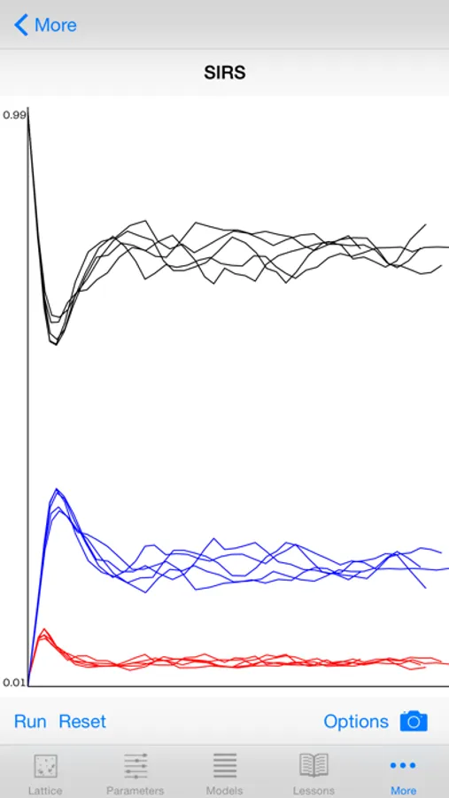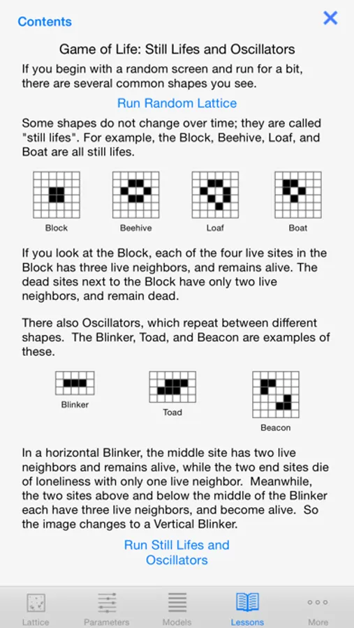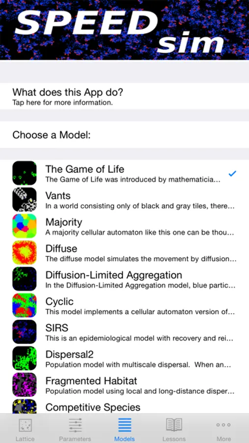 Note that the simulations are generally computational intensive and will run more quickly on newer iOS devices or when you select a smaller lattice size. The speed adjuster brought up from the Options menu near the bottom of the Lattice screen lets you slow down the simulation to observe the dynamics more closely. The larger screen on iPads allows for a much nicer interface, but the app is fully functional on iPhones and iPod Touches as well.