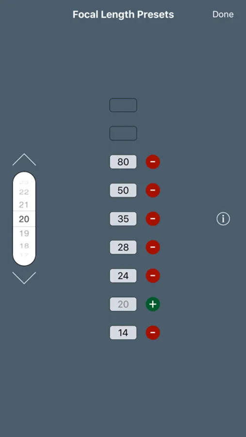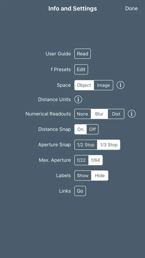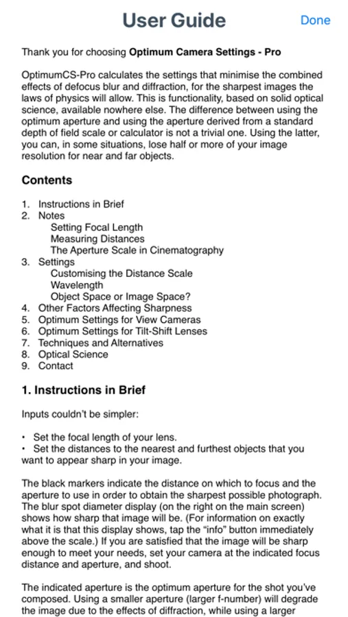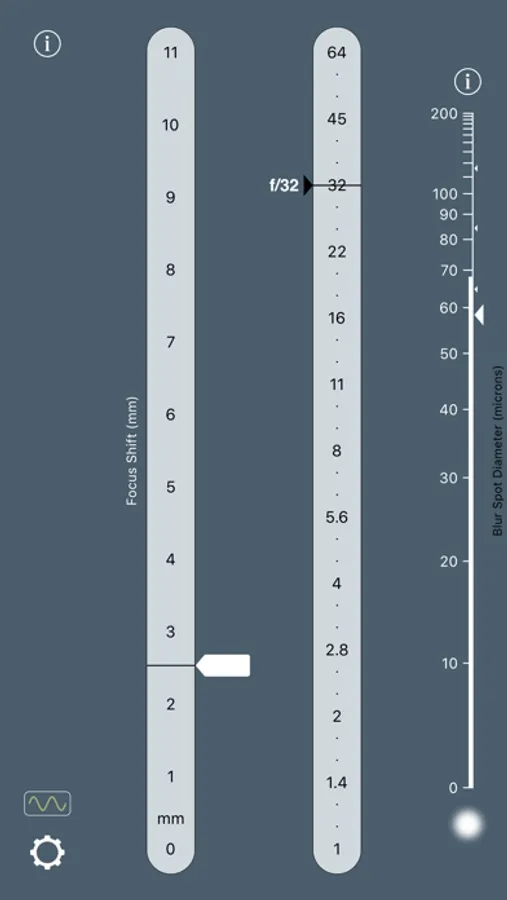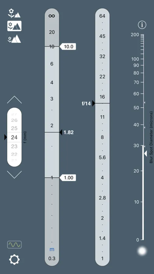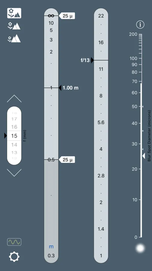 • The app instantly displays the focus distance and aperture that minimise the combined effects of defocus blur and diffraction.