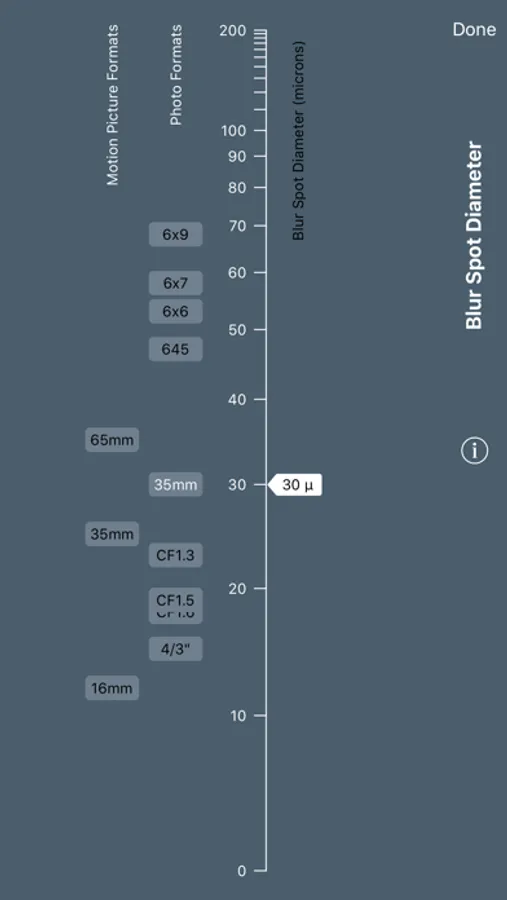 • A marker can be placed on the blur spot diameter scale as a reminder of what you consider acceptable blur sizes.