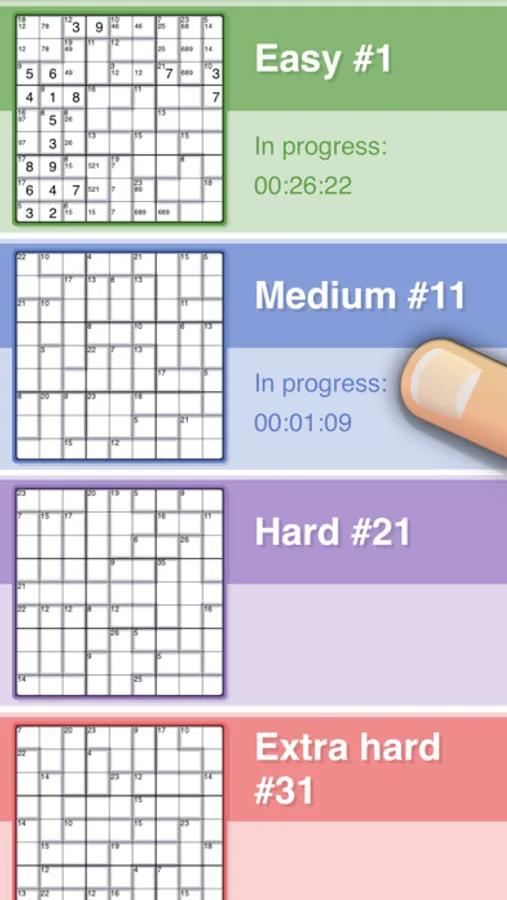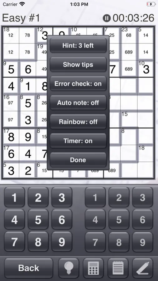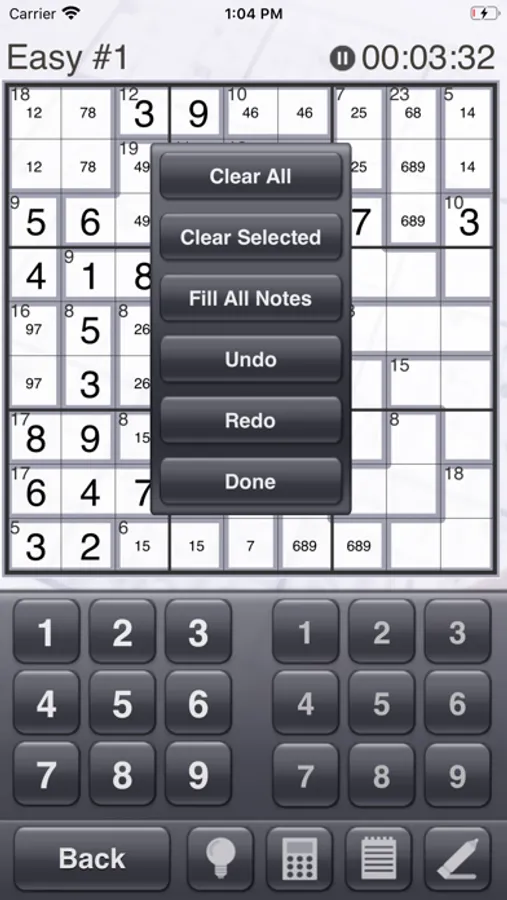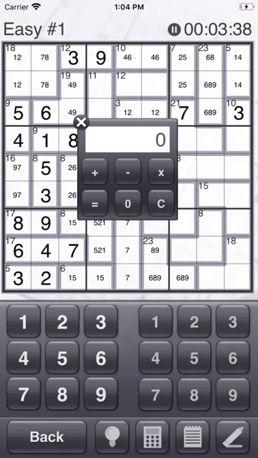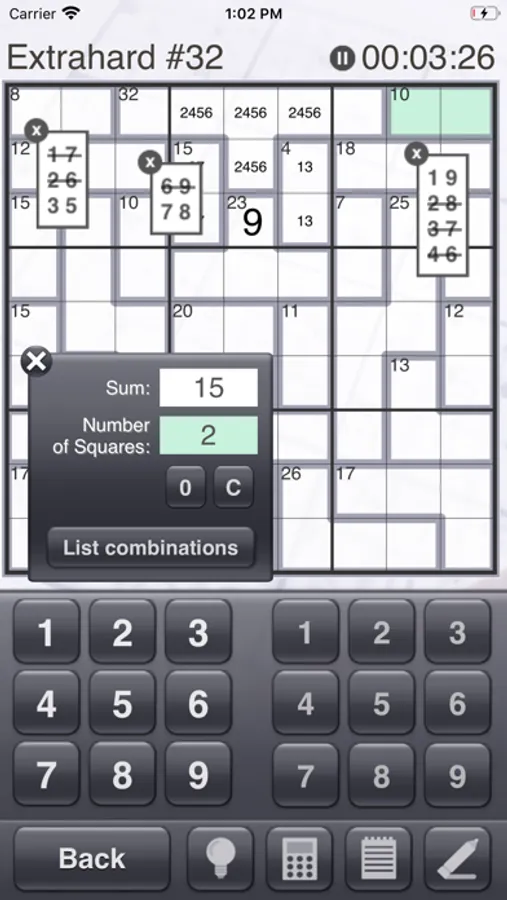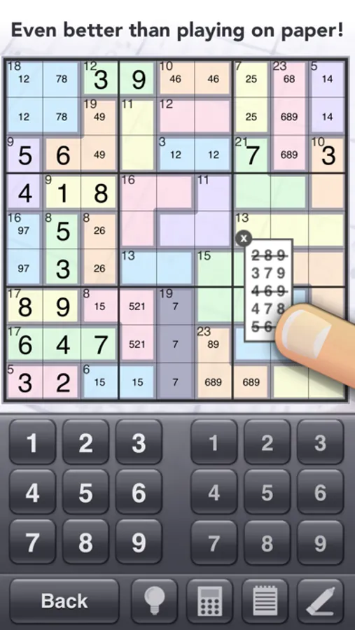 Solving a killer sudoku puzzle requires a lot of notes, so we worked hard to make the note entry features in this app perfect. A dedicated note keypad and the ability to select multiple squares makes entering notes fast. You can even make combination lists that float above the puzzle and can be rearranged on the screen! Cross out combinations from your lists as you rule them out.