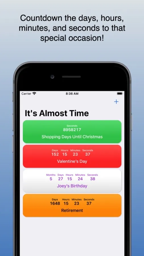Ever wonder how long until your next vacation, how many shopping days until Christmas, or how long until your next birthday? Well, now you can have that information at your finger tips. You simply enter the date and time of the event of interest and watch the seconds tick away!