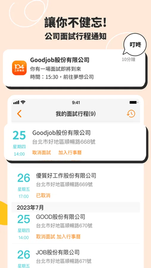 ●面試行程管理 -面試行程記不住?提醒通知不怕錯過,還有取消面試功能!