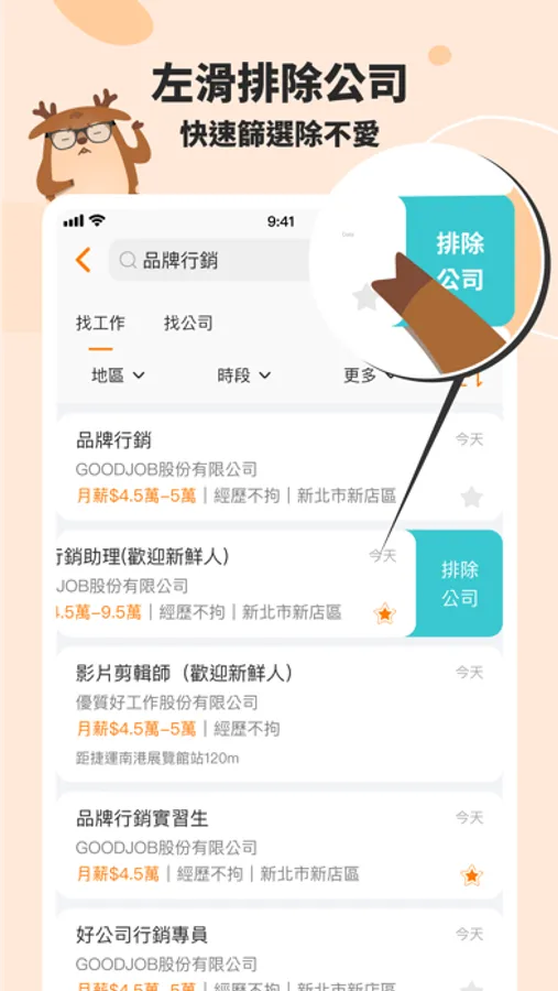 ●排除不愛工作 -看職缺不眼花,一指排除公司、產業和派遣工作,超省力!