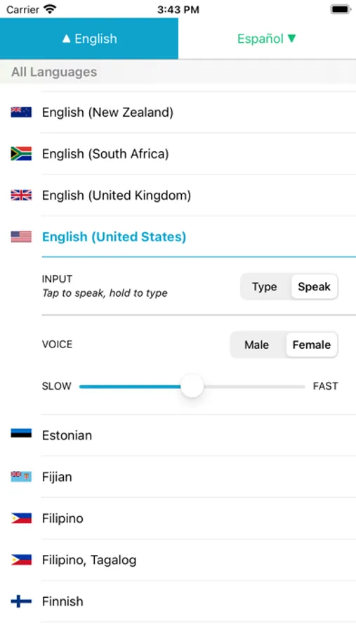 Quickly change languages, choose male or female voices (where available), and speed up or slow down the rate of speech