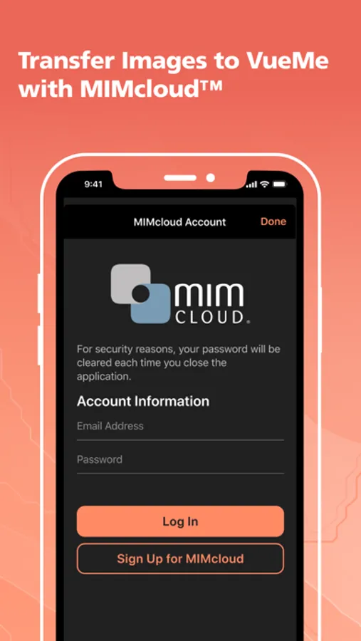 VueMe downloads data using encrypted transfer over the wireless network. You can set a passcode that encrypts the non-image information for the downloaded data and prevents unauthorized access.