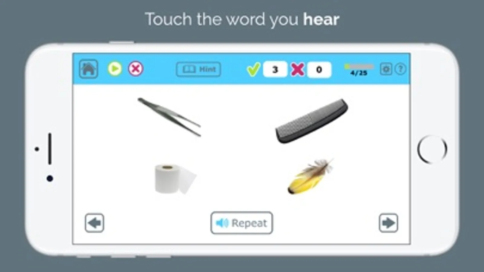 - "Listen": match an auditory stimulus (spoken word) to a picture