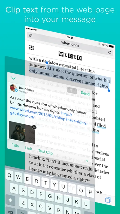 How about selected text in Safari? Linky's Web Clipper extracts selected text and carries it over to the composer sheet, ready for you to edit. You can also make a text shot from the text selection for sharing as a beautiful image.