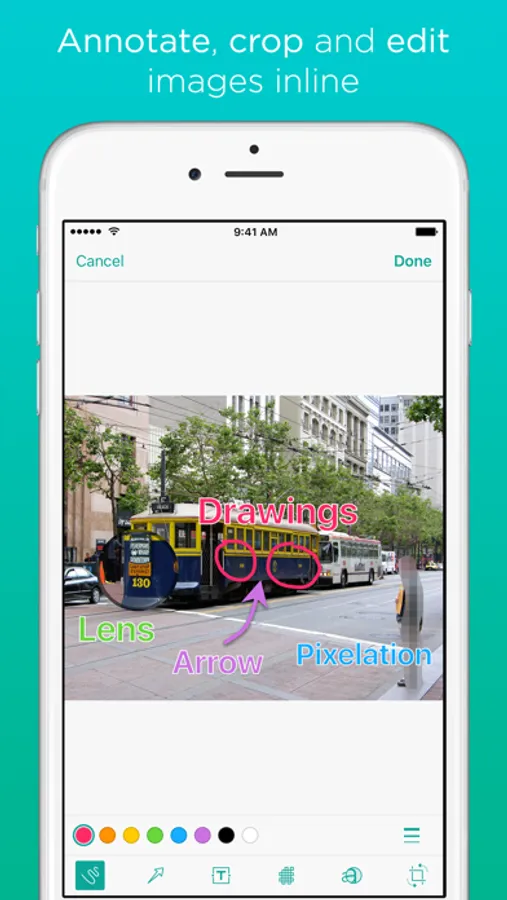 • Markup: annotate, crop and edit images inline. Available tools: Sketch, arrows, lenses, text blocks, pixelate, crop & rotate.