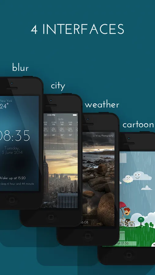 The home page allows you to see directly the weather conditions, the next alarm and the countdown to the next alarm.