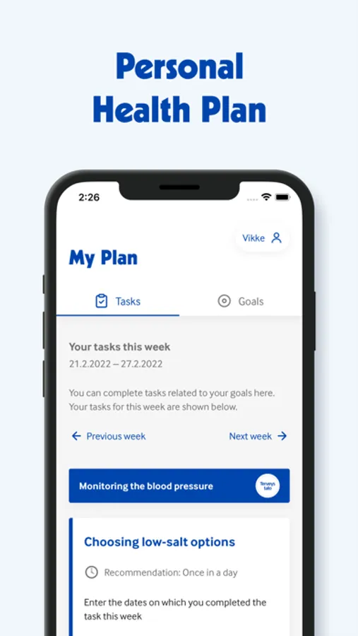 The personal plan includes goals that support your health. It is easy to record your own measurement results and self-evaluations in the plan. It also includes your personal physiotherapy programs with videos.