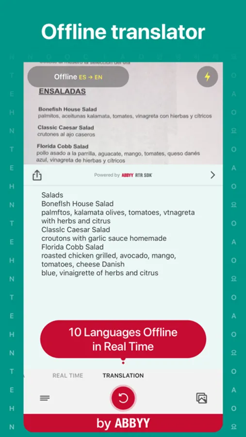 • Real-Time Translation directly on the camera screen without taking photos into 100+ languages online (full-text translation) and 10 languages offline (word-by-word translation).