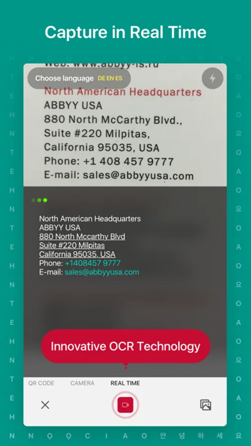 • Innovative Real-Time Recognition mode based on ABBYY RTR SDK technology will digitize printed text directly on the camera screen without taking photographs.