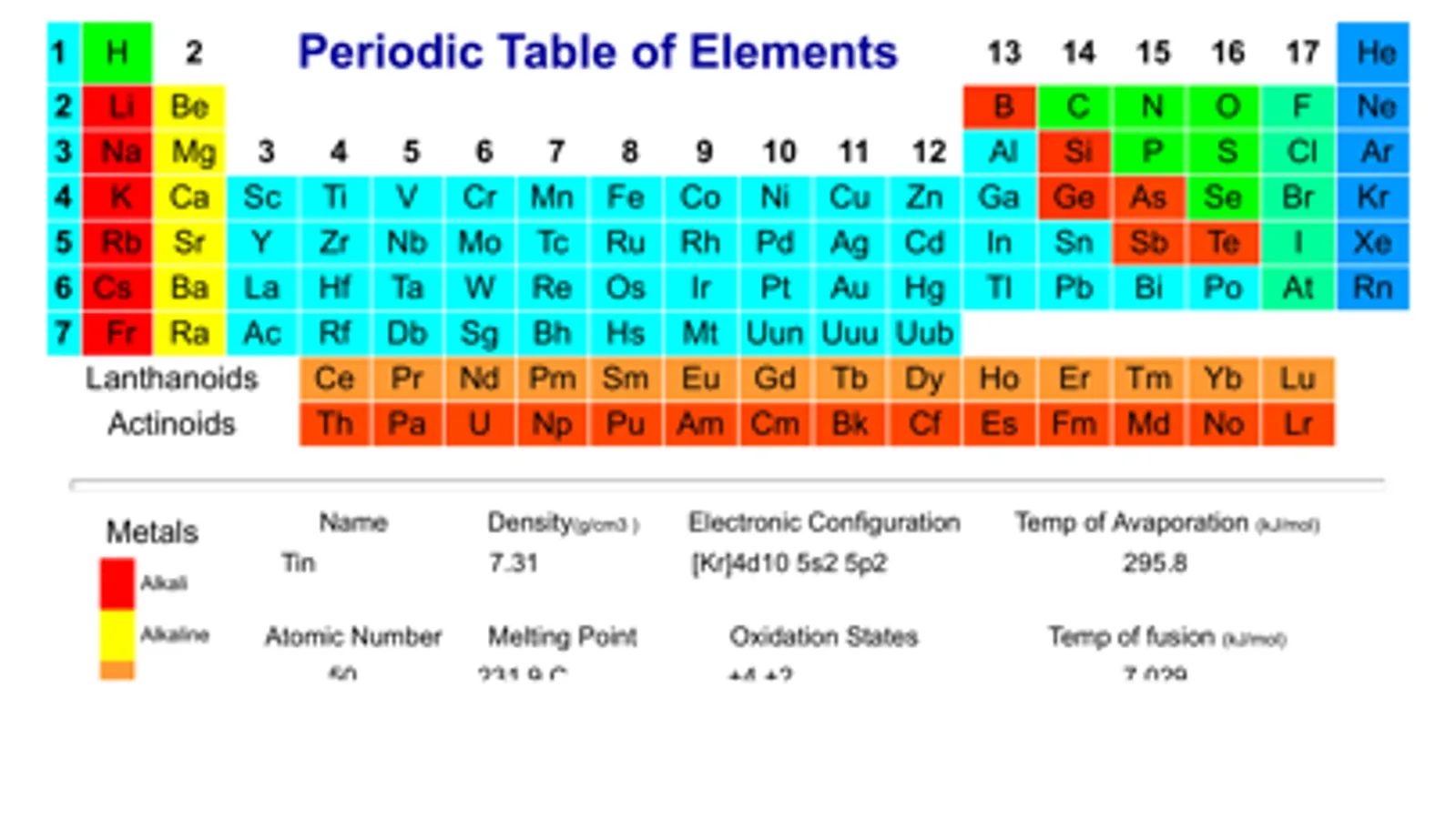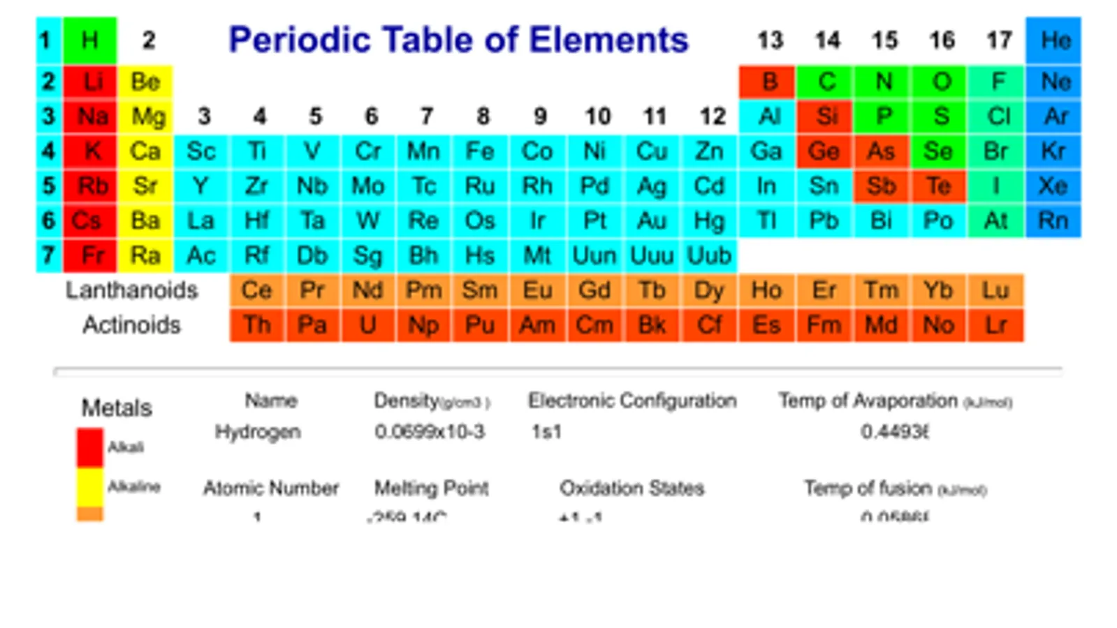 A color coded periodic table of elements that includes the name, density, electronic configuration, atomic number, melting point and much more of the elements!