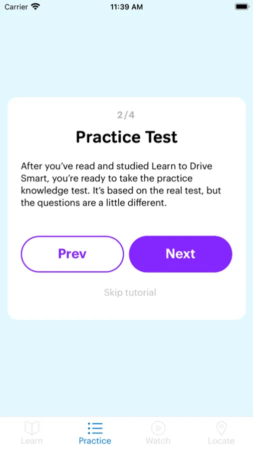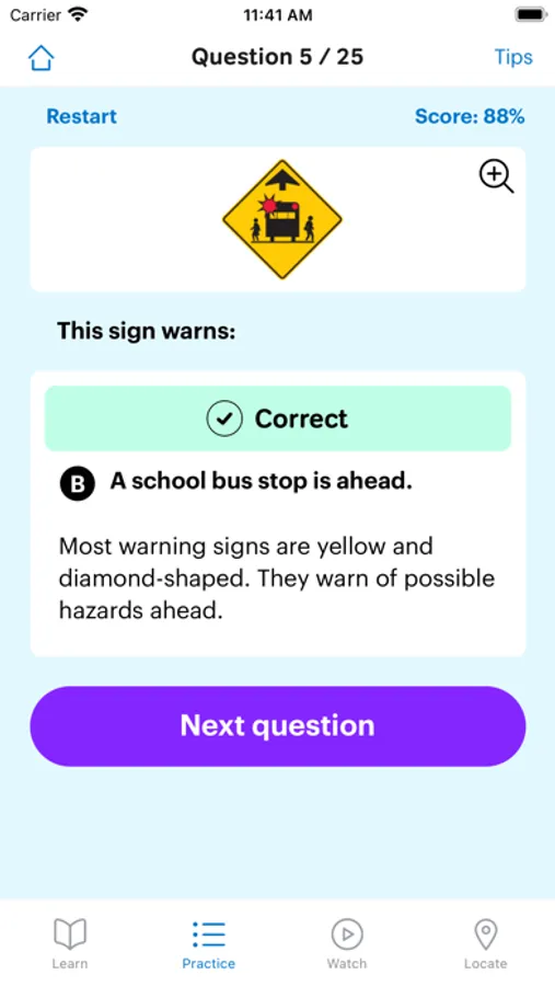 As you answer questions, the app lets you know if you’re on track and where to look in learn to drive smart for more info.