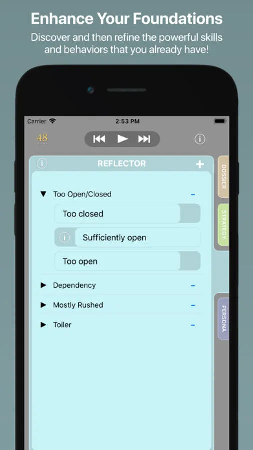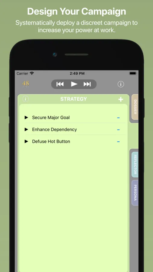 “Foundations” is the first in a series of apps that provide discreet, on-the-job training in the Arts of Power: how to acquire, maintain, and expand your power in the workplace. It is based on the New York Times best-selling book, The 48 Laws of Power, by Robert Greene.