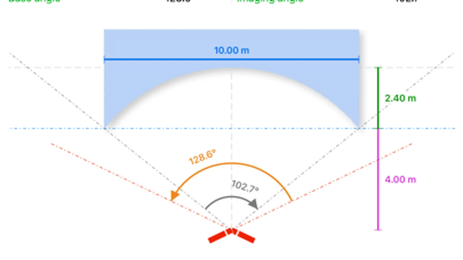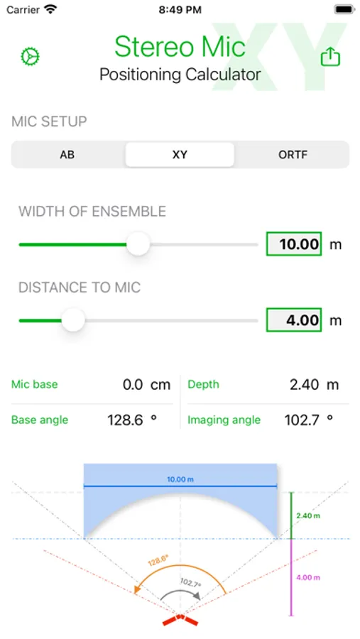 Input your parameters (in meters) with the sliders, or use the text fields. If you swipe to the next page, you’ll see a figure depicting the dimensions of the microphone setup—true to scale.
