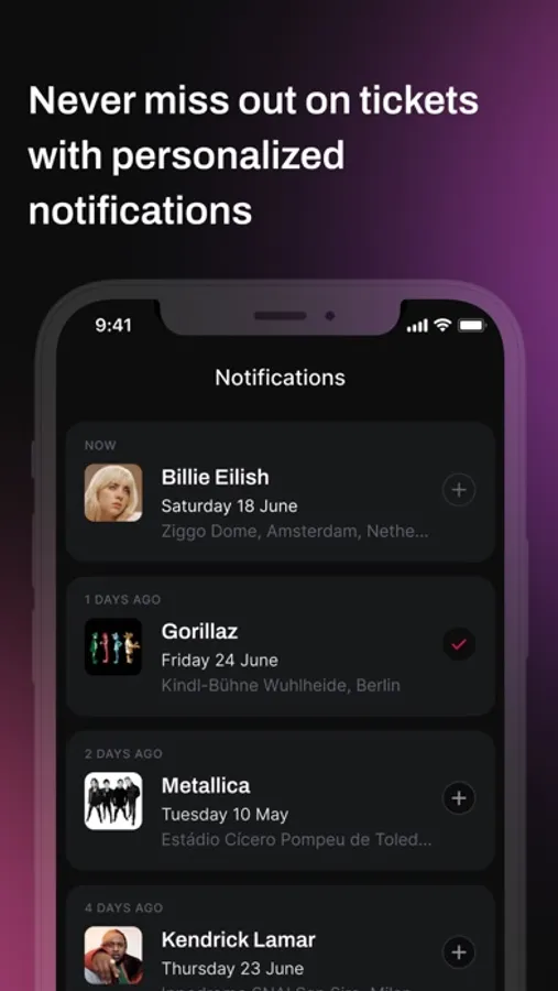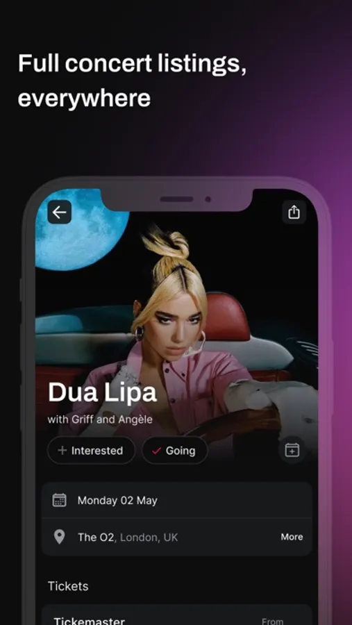 Our free app lets you track artists in one tap, connecting with services like Apple Music, Spotify, Facebook and Deezer. We’ll build a personalized local concert guide just for you, so you can add shows to your plans and easily set reminders to buy tickets. Whether you’ve been to 1 concert or 100, Songkick makes live music infinitely easier for everyone.