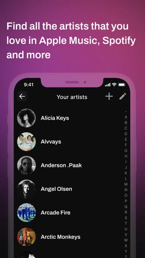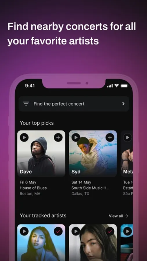 • Instantly track your favorite artists with imports from your music library, Apple Music, Spotify and Facebook.