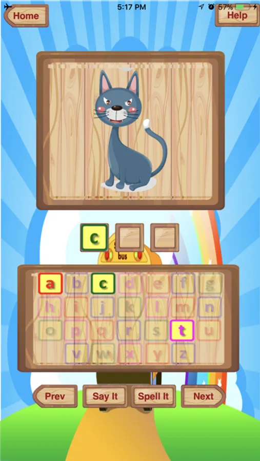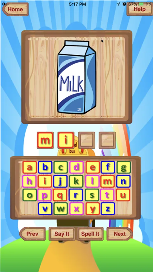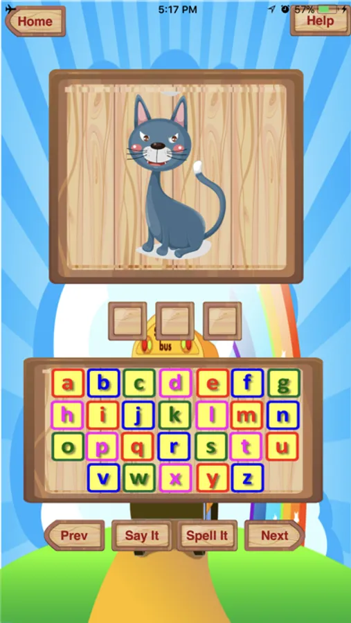 'Spell-It' Tapping on the button will spell the word, kids listen to it and learn how to spell it. The best way to memorize the spelling is listening to it. Great feature, along with Help, see next.