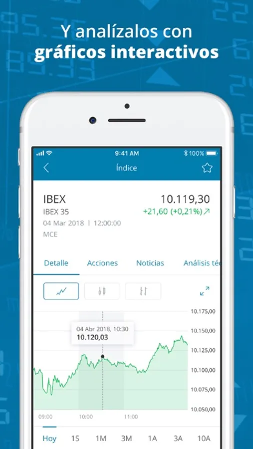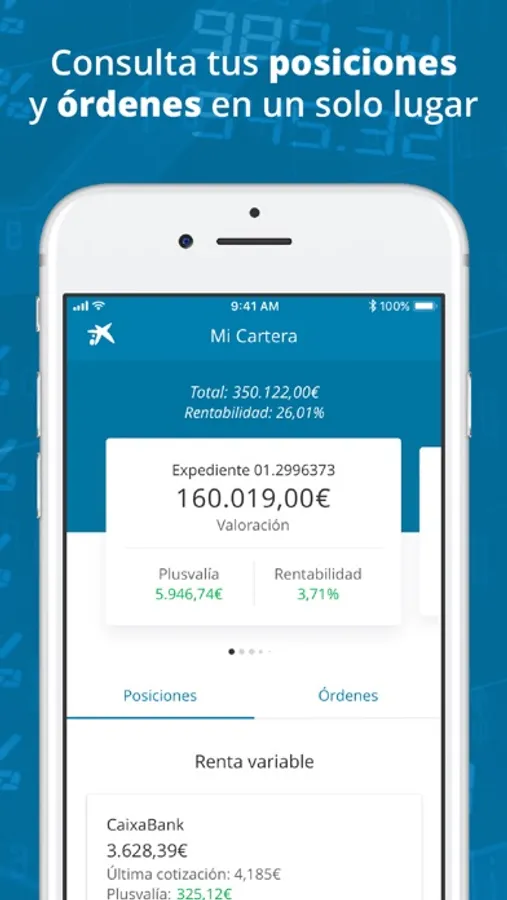 Descarga gratis BrokerNow, la nueva app de CaixaBank, y empieza a gestionar tu cartera de valores y acciones de empresa y analizar tu evolución y rentabilidad financiera. Realiza un seguimiento de acciones, valores futuros y más gracias a los gráficos interactivos disponibles. Con BrokerNow de “La Caixa” maximizarás el rendimiento de tus activos financieros.