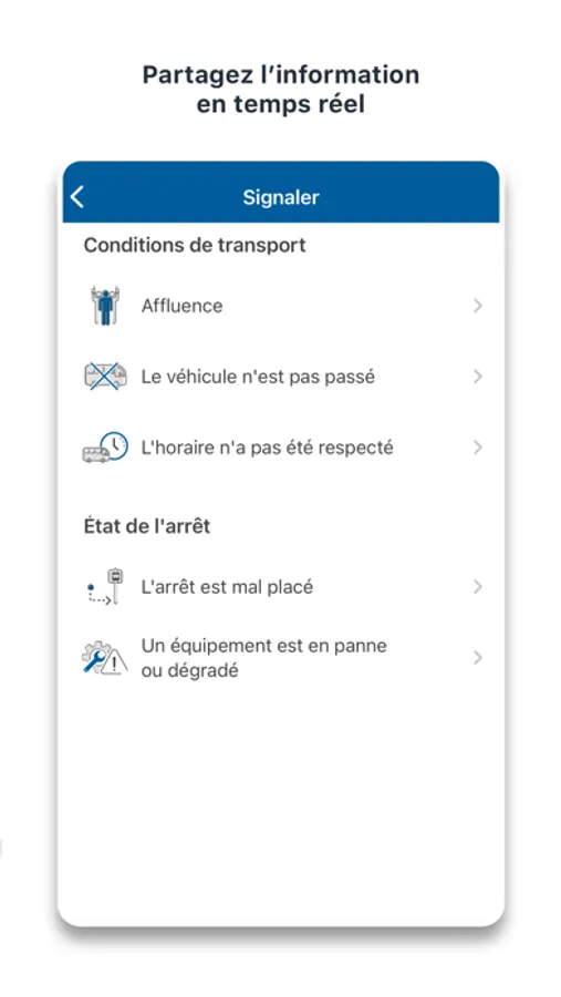 - Crowdsourcing : Signalez à tout moment les évènements rencontrés sur votre chemin et gagnez des points pour améliorer votre profil !