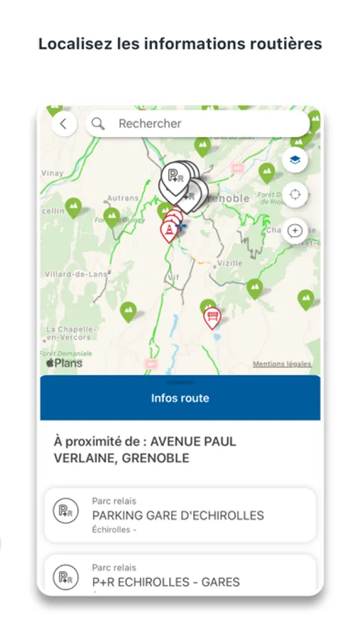 - A proximité : visualisez sur une carte interactive les points d’arrêts des réseaux de transport (avec possibilité de consulter les horaires de passage), les parcs relais, les stations d’auto partage et de covoiturage ainsi que les conditions de circulation en temps réel, avec indication des chantiers et événements, ouverture et fermeture des cols, temps de parcours vers les stations des Alpes.