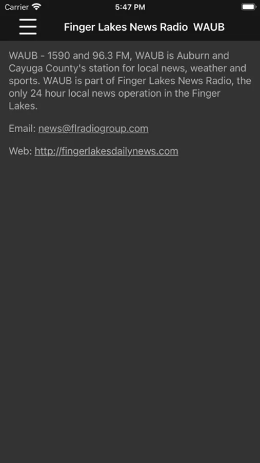 WAUB is Finger Lakes News Radio for the Eastern Finger Lakes region. WAUB features the Finger Lakes Morning News weekdays from 5:30 a.m. to 9:00 a.m., interesting talk from Brian Kilmeade, Dave Ramsey, Clark Howard, Mark Levin, Jim Bohannon, and Coast To Coast AM. WAUB is also your area home of Kevin Williams weather forecast and coverage of area High School sports.