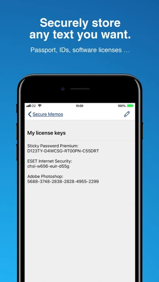 - Secure memos protect your passport, IDs, software licenses and much more.