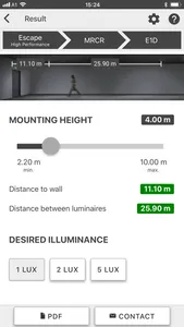 How many emergency luminaires are needed? And where do they have to be mounted? The Zumtobel RESCLITE PRO app delivers the answers and completes the planning task within seconds: After only 3 clicks and the selection of the mounting height, the app displays the maximum distance from the wall to the luminaire and between 2 luminaires.