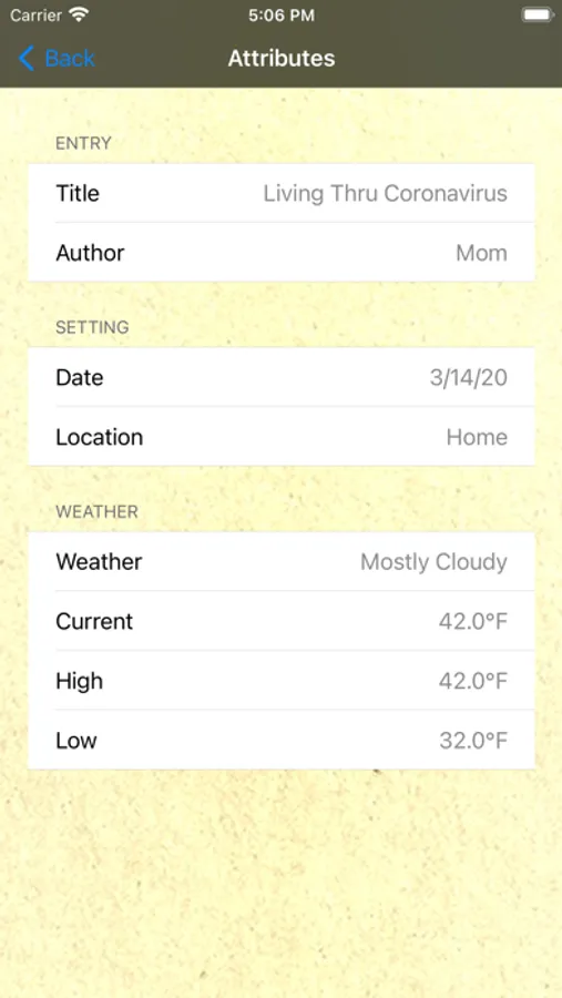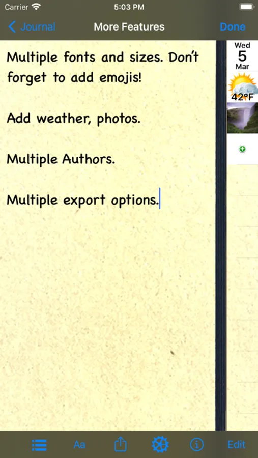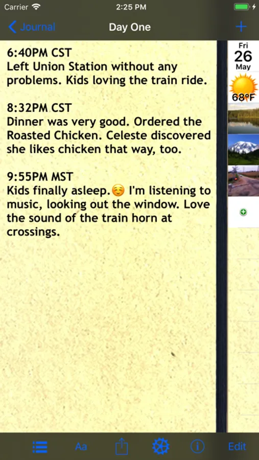 Keep a detailed travel journal for each trip. Note weather. Get location. Choose your font, font size, and enter text and emojis. Journals organized by trip, and entries organized in stylish table of contents.