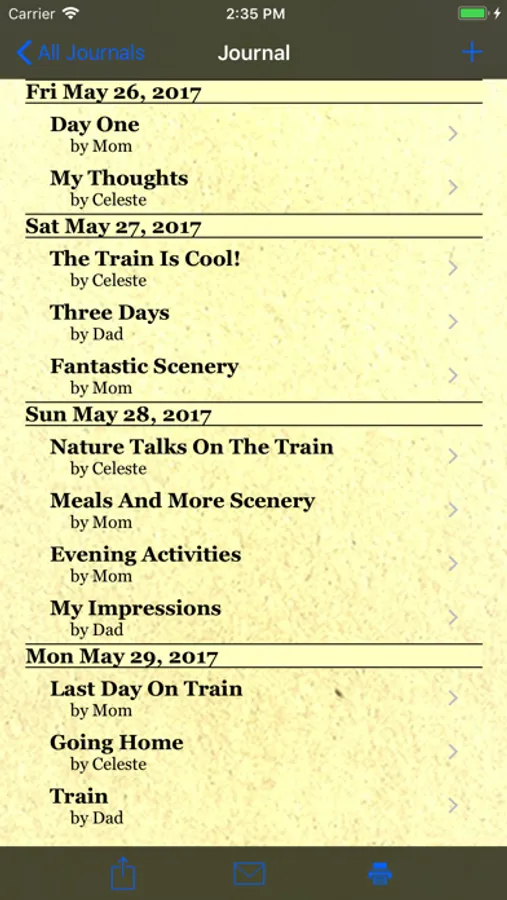 - Email journal entries, complete trip journals, or photos