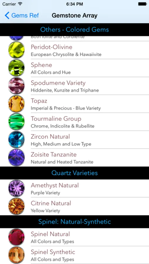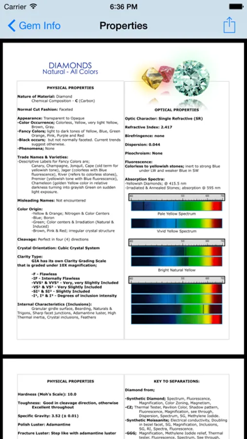 Gem Reference Section, provides quick Gem Info. If required, a detailed Physical and Optical Properties with Spectra Readings of commonly encountered Gems is tap away.