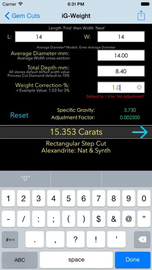 Entering Length & Width values automatically populates Average Diameter or Average Width and Total Depth as well. Major convenience when working on Ideal, Excellent and Very Good Proportioned Gems