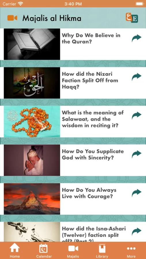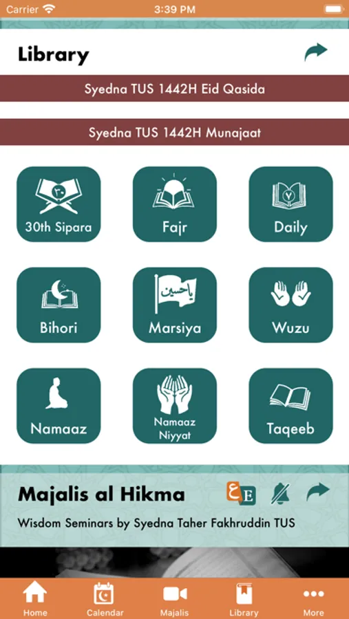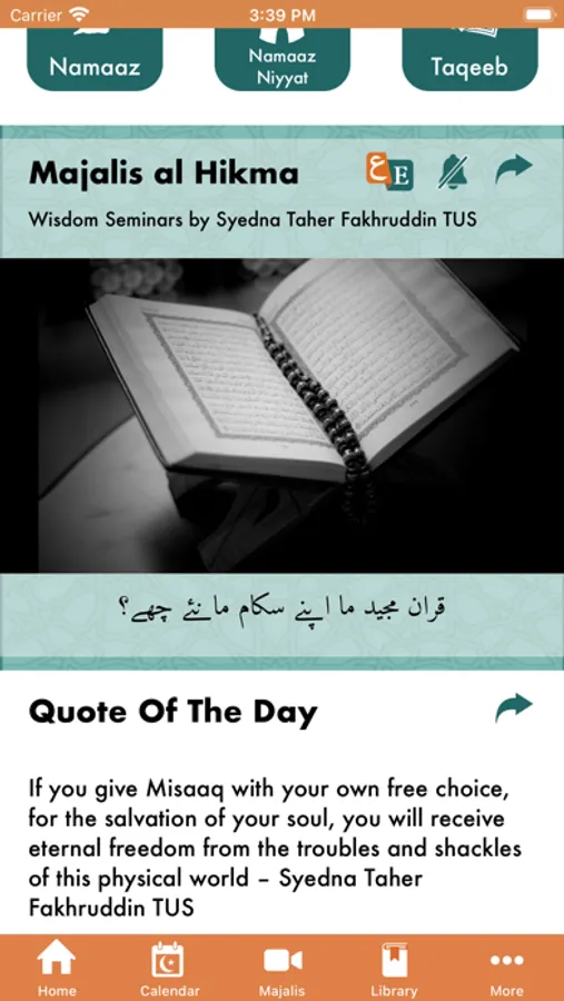• Majalis al Hikma (Wisdom Seminars) : Updates in all three languages – Dawat ni Zaban, Arabic and English weekly topics addressed by Syedna Taher Fakhruddin TUS, notifications option