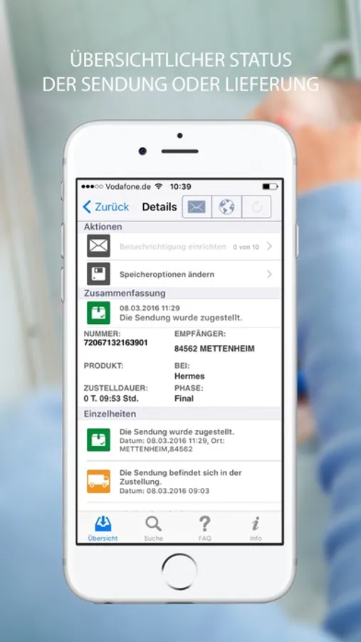 Die App bietet Ihnen zudem die Möglichkeit aktive Benachrichtigungen zu einer Sendung einzurichten. Damit können Sie den Fortschritt einer Sendung überwachen oder Probleme frühzeitig erkennen. Warten Sie nicht mehr, ob ein Paket kommt oder nicht, sondern steuern Sie, ob Sie bspw. über jeden nächsten Status oder über den Status zu einer bestimmten Uhrzeit informiert werden wollen. Benachrichtigungen können dabei sowohl per E-Mail oder als auch als Push-Benachrichtigungen direkt auf Ihr iPhone zugestellt werden.