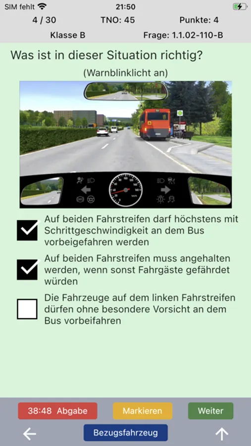 - "Weiter"-Button drücken mit keiner Antwort ausgewählt = nächste Frage