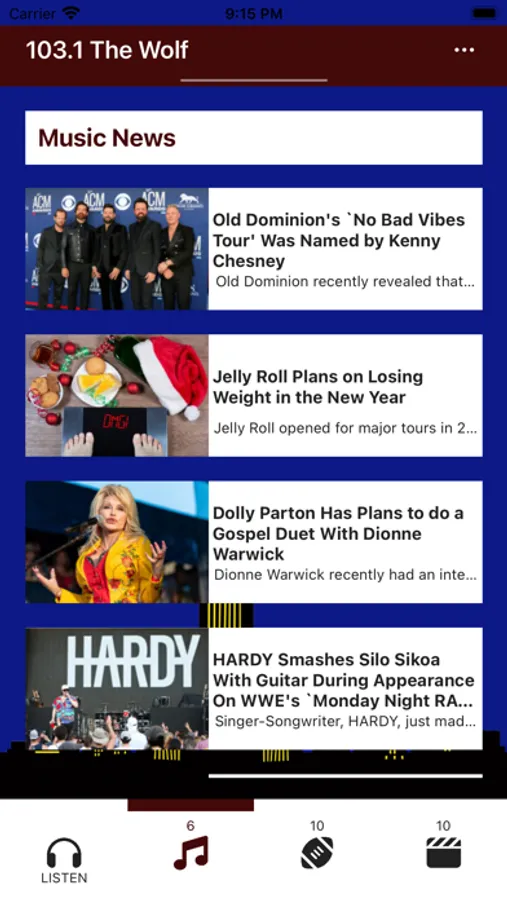 The 103.1 The Wolf app brings you the music of Luke Bryan, Blake Shelton, Kenny Chesney, Carrie Underwood, Florida Georgia Line and so many others.