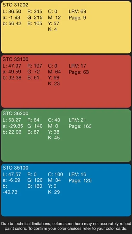 Due to technical limitations, colors seen in this App may not accurately reflect paint colors. To confirm your color choices refer to your color cards.
